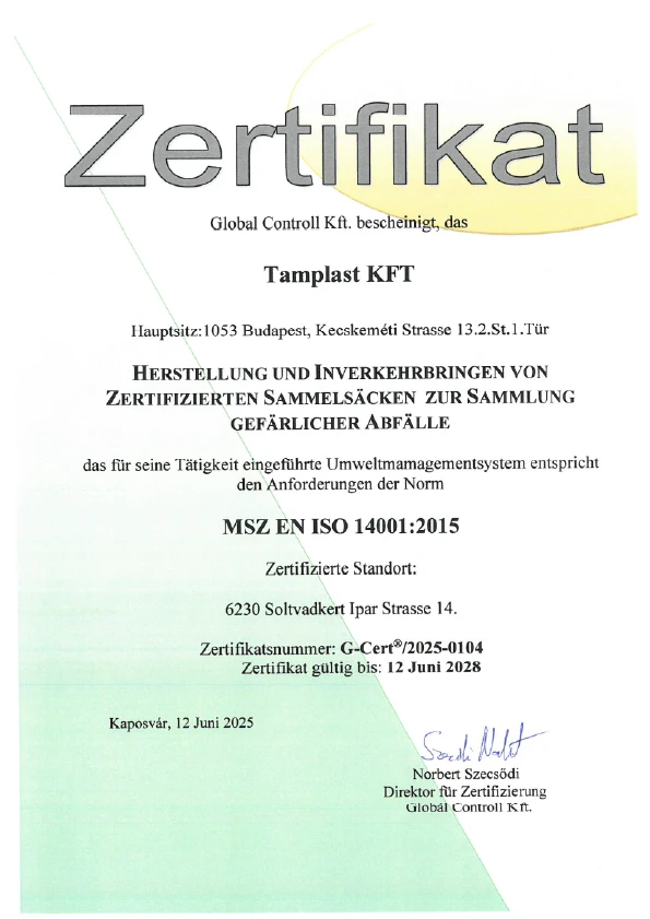 ISO 14001:2015 (MSZ EN ISO 14001:2015) Umweltmanagementsystem-Norm: Der Schutz und die Erhaltung unserer Umwelt, dervernünftige Einsatz von Ressourcen und Technologien ist eine realistische undhöchst verantwortungsvolle Anforderung unserer Zeit. Das Umweltmanagementsystemnach ISO 14001 ist ein Instrument, mit dem unser Unternehmen sicherstellenkann, dass unsere Tätigkeiten unter kontrollierten Bedingungen durchgeführtwerden, die den Umweltanforderungen entsprechen, ohne die Umwelt zu gefährden.
