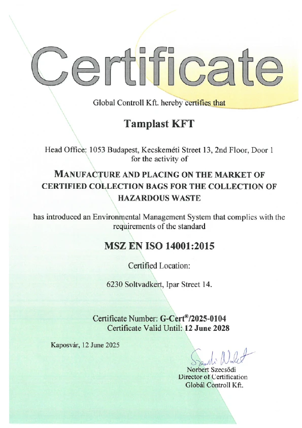 ISO 14001:2015 (MSZ EN ISO 14001:2015) Standard for Environmental Management System (EMS): Protecting and preserving our environment, using resources and technology wisely is a realistic and highly responsible requirement of our time. The ISO 14001 environmental management system is a tool that our company can use to ensure that our activities are carried out under controlled conditions that meet environmental requirements without compromising the environment.